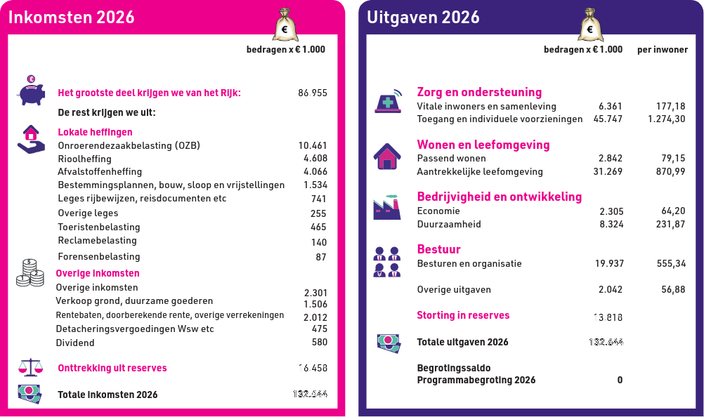 Al een aantal jaren spreken we erover dat we, net als veel andere gemeenten in Nederland, minder geld van het Rijk krijgen via de Algemene uitkering; 2026 kreeg de naam 'Ravijnjaar'. In voorgaande jaren hebben we stappen gezet om hiervoor passende maatregelen te nemen. Maar de stijging van de zorgkosten voor jeugdzorg en Wmo zorgen voor nieuwe tekorten vanaf 2026. In de Perspectiefnota 2026-2029 las u dat al. Voor de verbetering van de begrotingssituatie stelden we maatregelen voor in die Perspectiefnota 2026-2029 (juni 2025). Deze nemen we mee in de programmabegroting. Met die maatregelen, de ontwikkelingen van onder andere de Meicirculaire en het afzien van de verkoop van de ondergrondse milieucontainers zien we het financiële beeld wijzigen. Voor de dekking van het begrotingstekort is een bijdrage vanuit de Algemene reserve nodig van € 888.000 in plaats van € 1,6 mln (€ 704.000 V). Met die bijdrage hebben we een sluitende begroting.